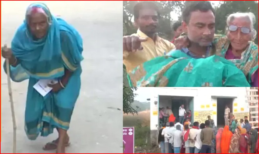 Bihar Chunav 2025: पोलिंग बूध पर बुजुर्ग महिला को गोद में लेकर पह...